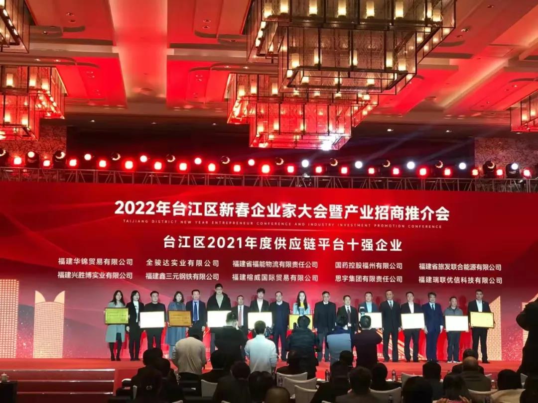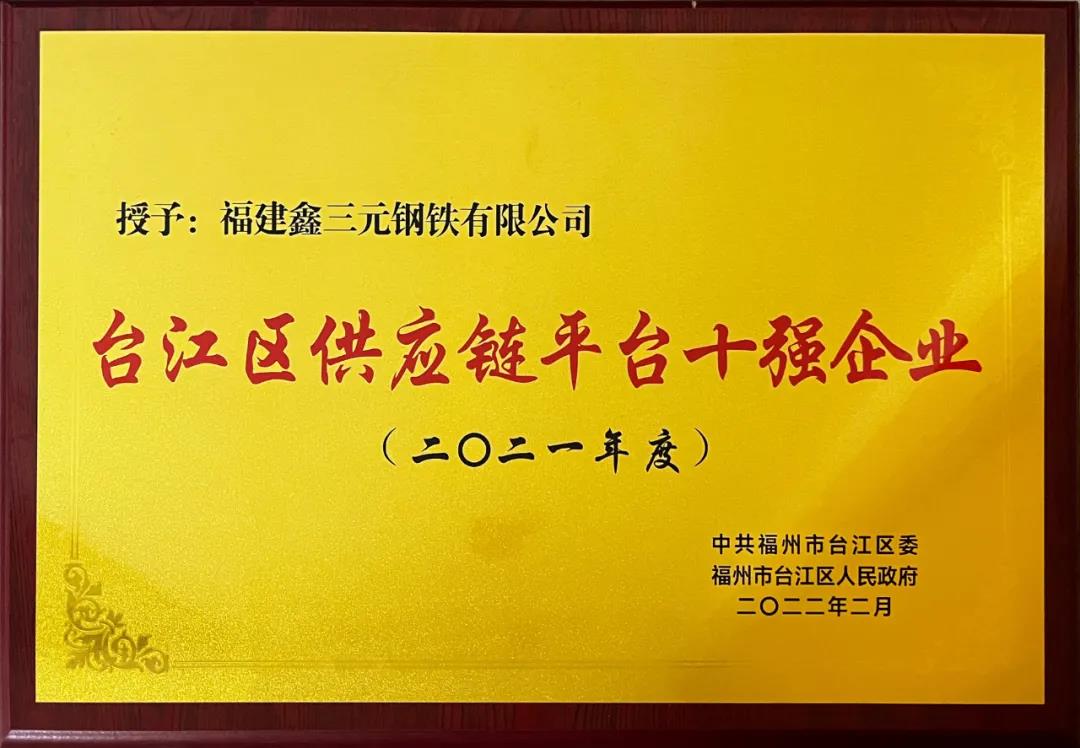 明海鑫旗下福建鑫三元鋼鐵有限公司,榮獲中共福州市臺(tái)江區(qū)委福州市臺(tái)江區(qū)人民政府頒發(fā)的2021年度“臺(tái)江區(qū)供應(yīng)鏈平臺(tái)十強(qiáng)企業(yè) ”稱號(hào)。