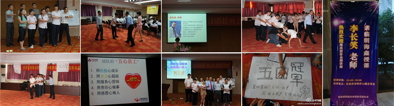 2013年6月29日,福建明海鑫企業(yè)股份有限公司邀請聚成集團(tuán)金牌講師李長笑老師給明海鑫全體員工授課,培訓(xùn)主題是《職業(yè)化心態(tài)與團(tuán)隊(duì)建設(shè)》,課上大家學(xué)到了打開心中花園與建立陽光心態(tài),角色的交流互補(bǔ)與團(tuán)隊(duì)精神,在歡笑、激情、感動、感恩中圓滿完成了培訓(xùn),感謝李長笑老師、感謝明海鑫、感謝大家。