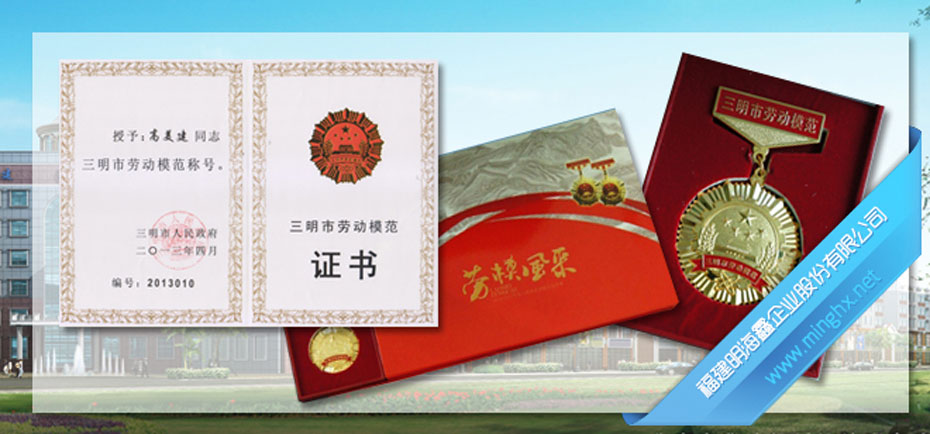 2013年4月27日,三明市人民政府召開(kāi)2010至2012年度三明市勞動(dòng)模范表彰大會(huì),會(huì)上福建明海鑫企業(yè)股份有限公司董事長(zhǎng)高美建等121名同志被三明市人民政府授予:三明市勞動(dòng)模范稱號(hào)。
